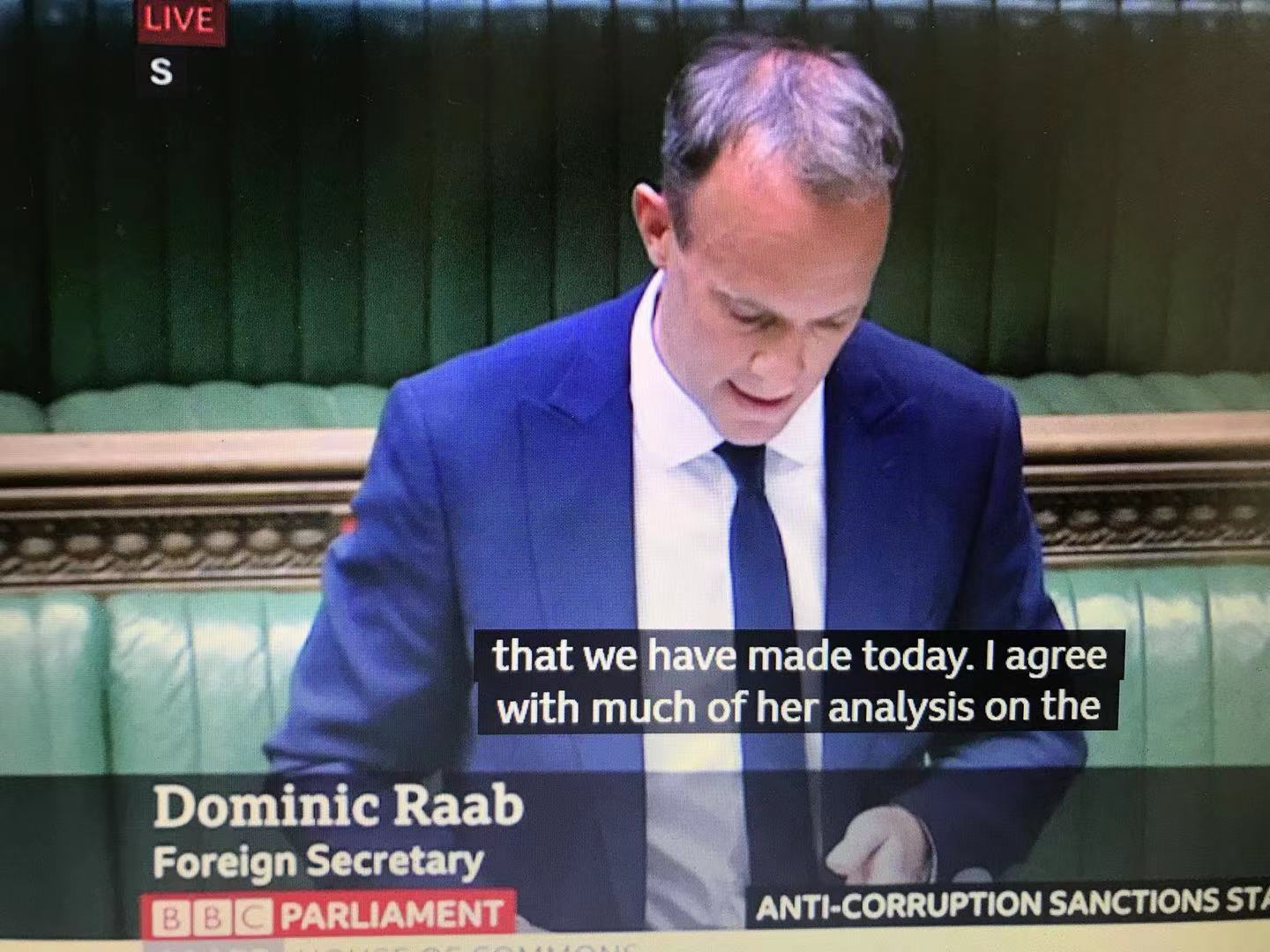 多米尼克·拉布称,与跨国有组织犯罪和战争冲突相关的腐败威胁英国的国家安全,滋生恐怖主义。英国首次针对腐败行为进行国际制裁,可以彰显英国的国家实力。