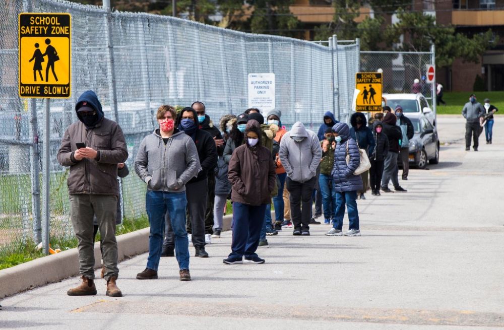 4月22日,在加拿大多伦多的一个临时疫苗接种点,市民排队等待接种。新华社发
