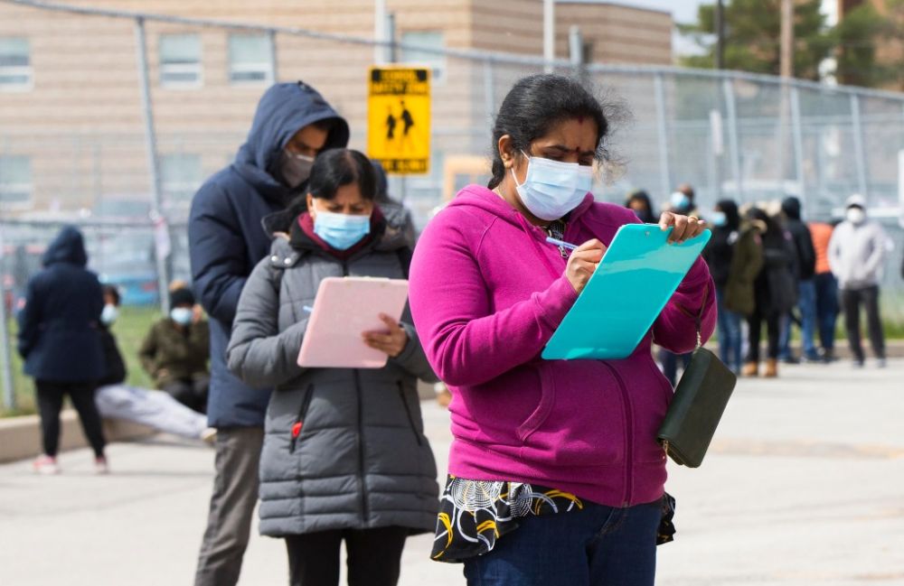 4月22日,在加拿大多伦多一个临时疫苗接种点,排队等待接种的市民填写登记表格。新华社发