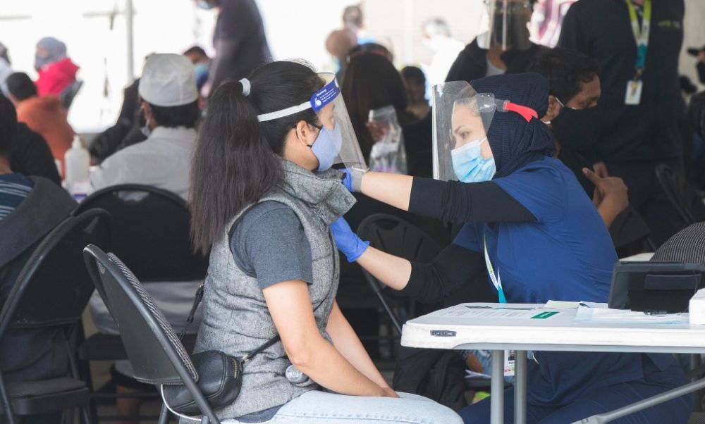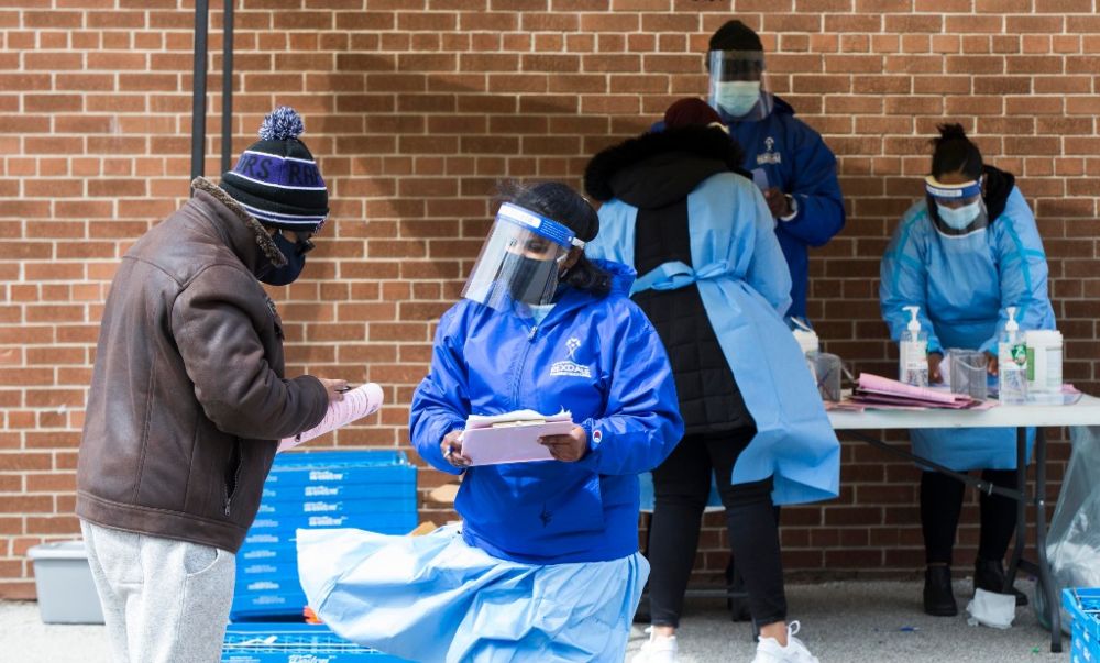 4月22日,在加拿大多伦多的一个临时疫苗接种点,医护人员接待接种市民。新华社发