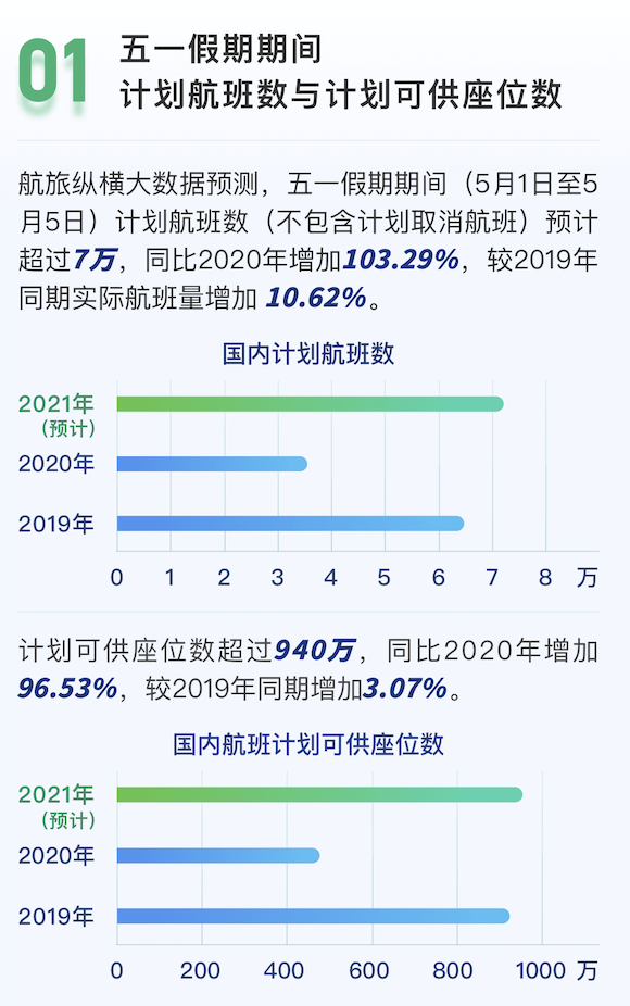 据航旅纵横大数据预测,假期间计划航班数预计超过7万,同比2020年增加103.29%,较2019年同期实际航班量增加10.62%。计划可供座位数超过940万,同比2020年增加96.53%,较2019年同期增加3.07%。