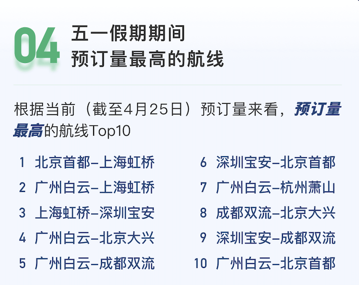 五一假期期间,预计超过798万人次预订机票,较2020年同比增长178.75%。广州白云至杭州萧山、成都双流至上海虹桥等航线的旅客量较2019年同期增长超40%。