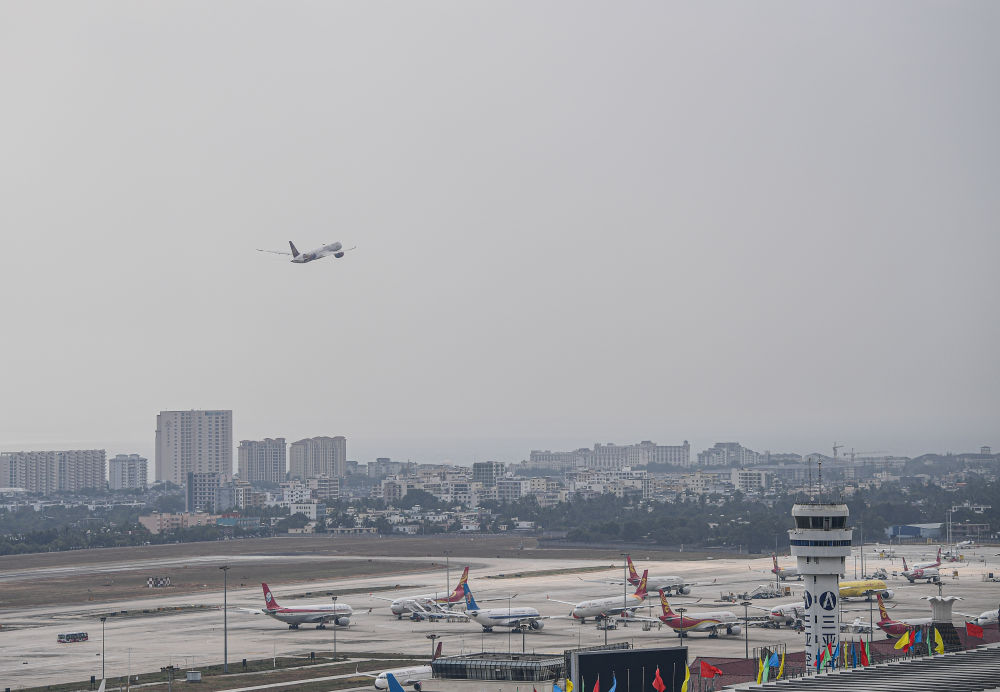 一架民航客机从三亚凤凰国际机场起飞。新华社记者 蒲晓旭 摄