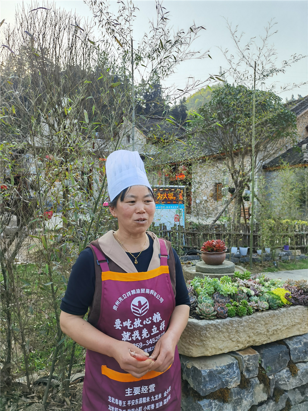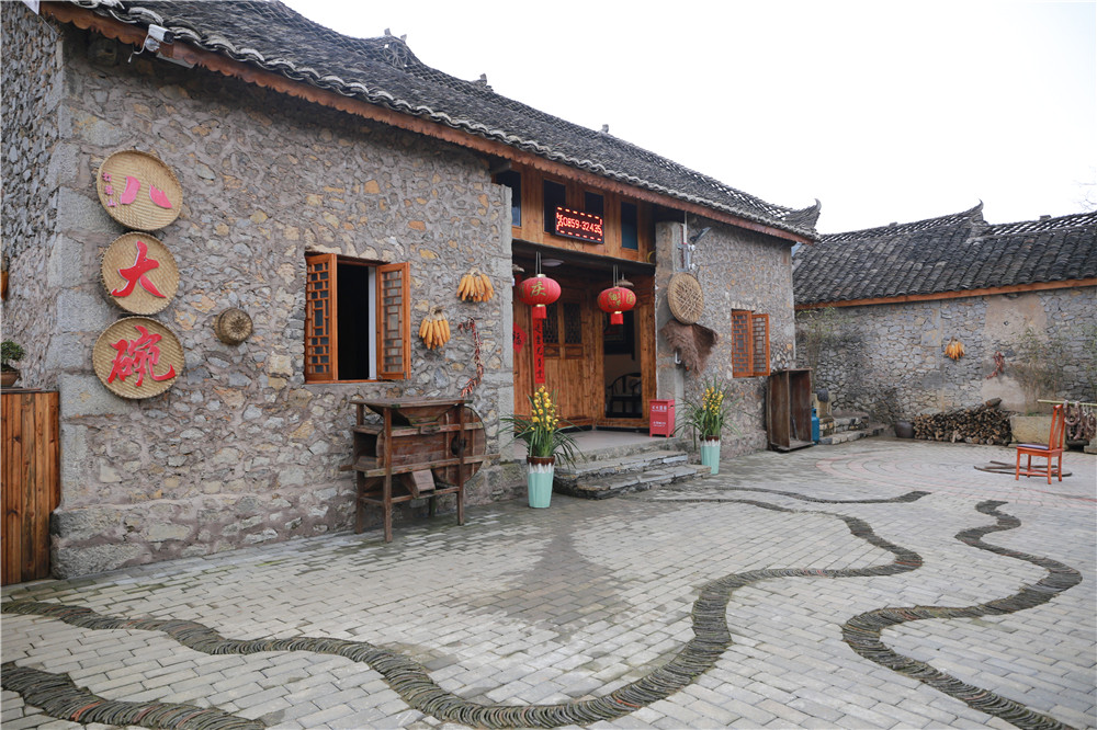 再往里走,是一个唤作“兴义人家”的农家乐。古树葱茏,石瓦房修葺一新,院落里堆着一捆捆干柴,连同簸箕、石磨、陶罐、木风车等老物件。