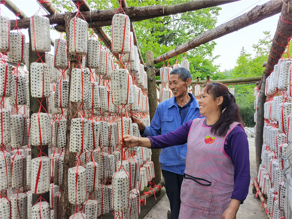 眼下,不论是外来的“新市民”,还是本地的原住民,食用菌都已成为一部分人的增收渠道。打柴山昔日的贫困户陶家友和妻子除了在基地务工,最近还在自家院坝搭起木架,挂了六千个木耳菌棒。“只要早晚洒点水,还有几天长出来就可以卖钱了。”陶家友说。