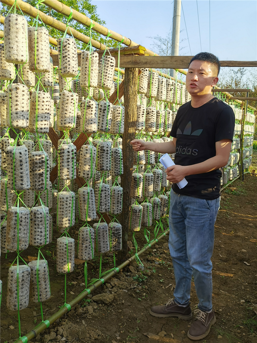 如今,这里已经风景别致:路边是一排排挂着长的木耳菌棒。它们被村民用绿色、红色的带子连接悬挂,巧妙地形成了“五环”“水立方”等造型。