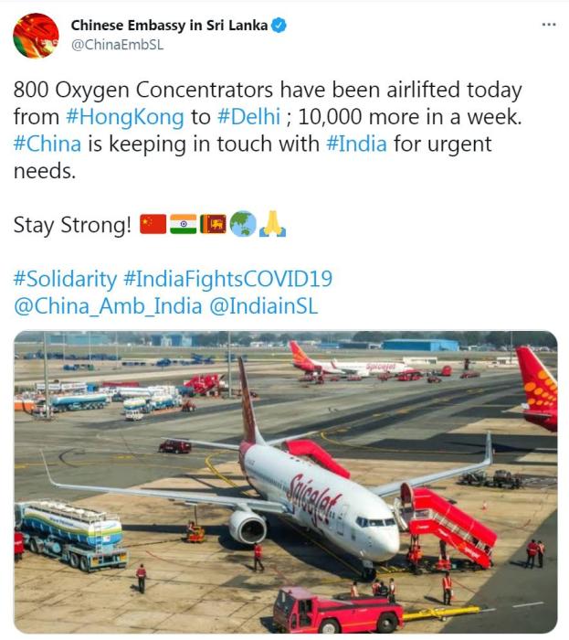 26日,中国驻斯里兰卡大使馆在社交网站称,已有800台制氧机自中国香港空运至印度德里,一周内,还将有10000台运抵。使馆还表示,“中国正与印度就(印方的)迫切需求保持接触”。