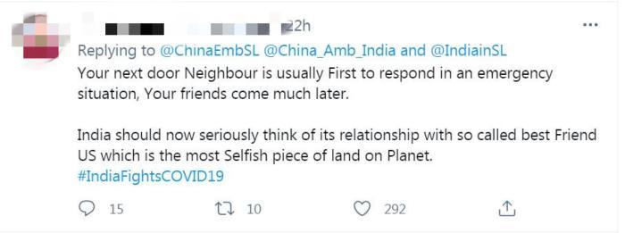 有印度民众称,在紧急情况下,最先做出反应的往往是你的近邻,而不是你的朋友。印度应该认真考虑与“所谓的最好的朋友美国”的关系,因为美国是“地球上最自私的一块土地”。