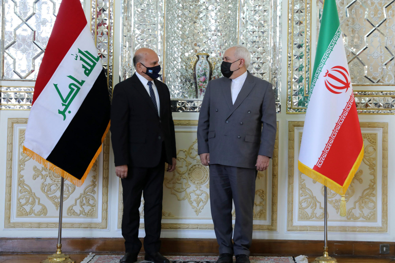 △伊朗外长扎里夫(右)会见伊拉克外长侯赛因(左)。图片来源:美联社