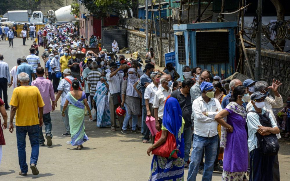4月26日,印度民众戴着口罩在孟买等待接种新冠疫苗。(新华社发)