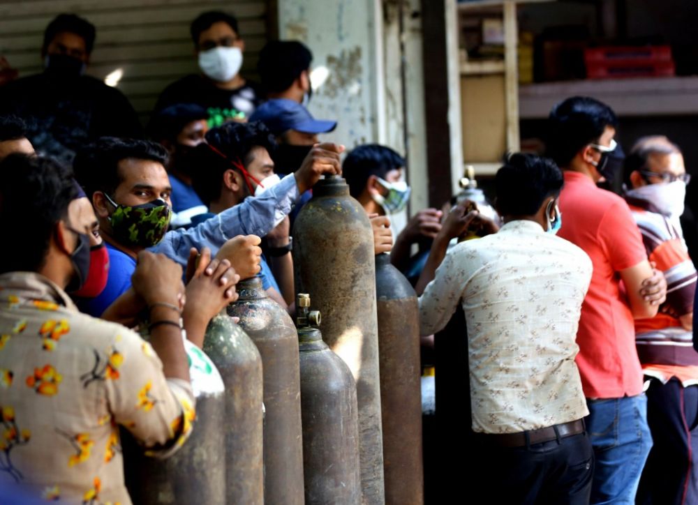 4月26日,新冠患者亲属在印度首都新德里排队等待为医用氧气罐充氧气。(新华社发,帕塔·萨卡尔摄)