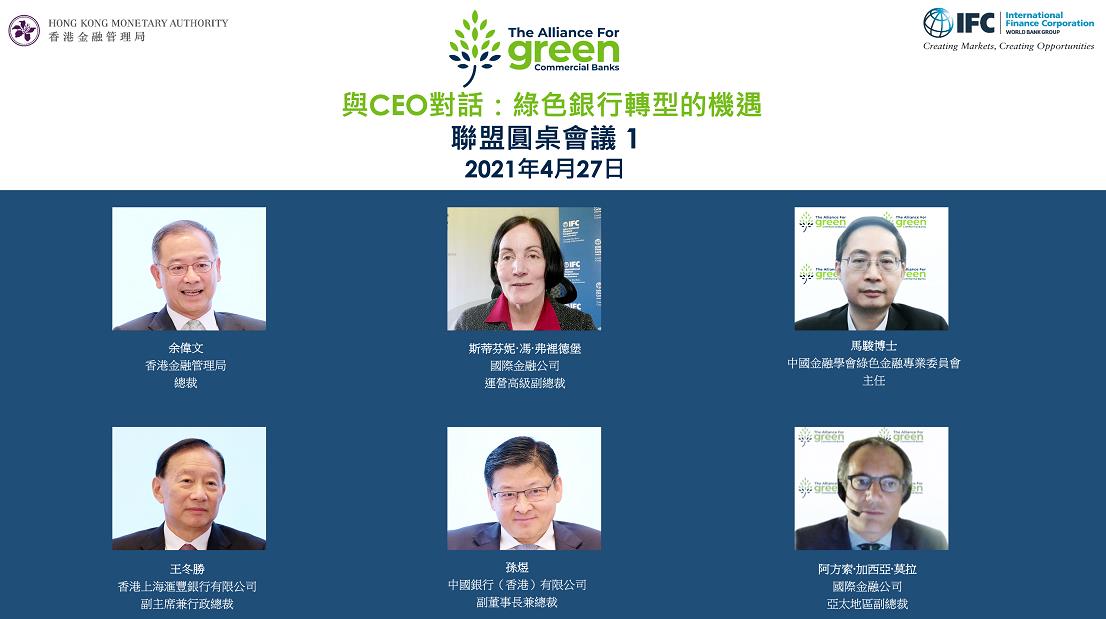 由香港金融管理局(金管局)和世界银行集团成员国际金融公司(IFC)共同发起的“绿色商业银行联盟”4月27日举办了线上首场圆桌会议“与CEO对话:绿色银行转型的机遇”。本次圆桌会议吸引了来自亚太、欧洲、中东、非洲和美洲等世界多国的参与者共计1100多位。