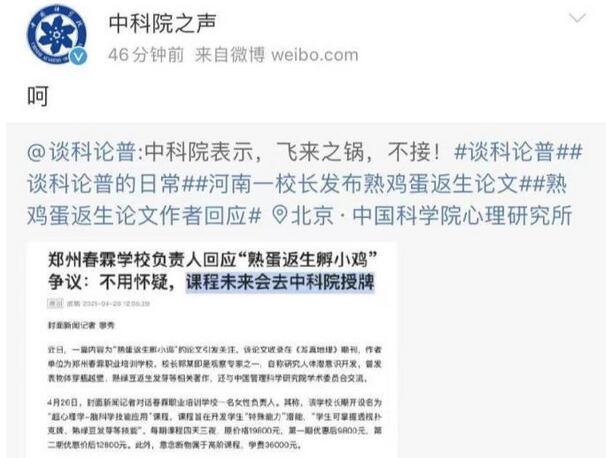 央视网消息:近日,一篇荒诞的论文引起了很多人的关注。这篇论文题目是《熟鸡蛋变成生鸡蛋(鸡蛋返生)——孵化雏鸡的实验报告》,由河南省郑州市春霖职业培训学校发表于《写真地理》杂志。论文描述称,“在该校导师指导下,学生通过超心理意识能量方法,使煮熟的鸡蛋变成生鸡蛋,并将返生后的鸡蛋孵化成小鸡,而且已成功返生40多枚”。