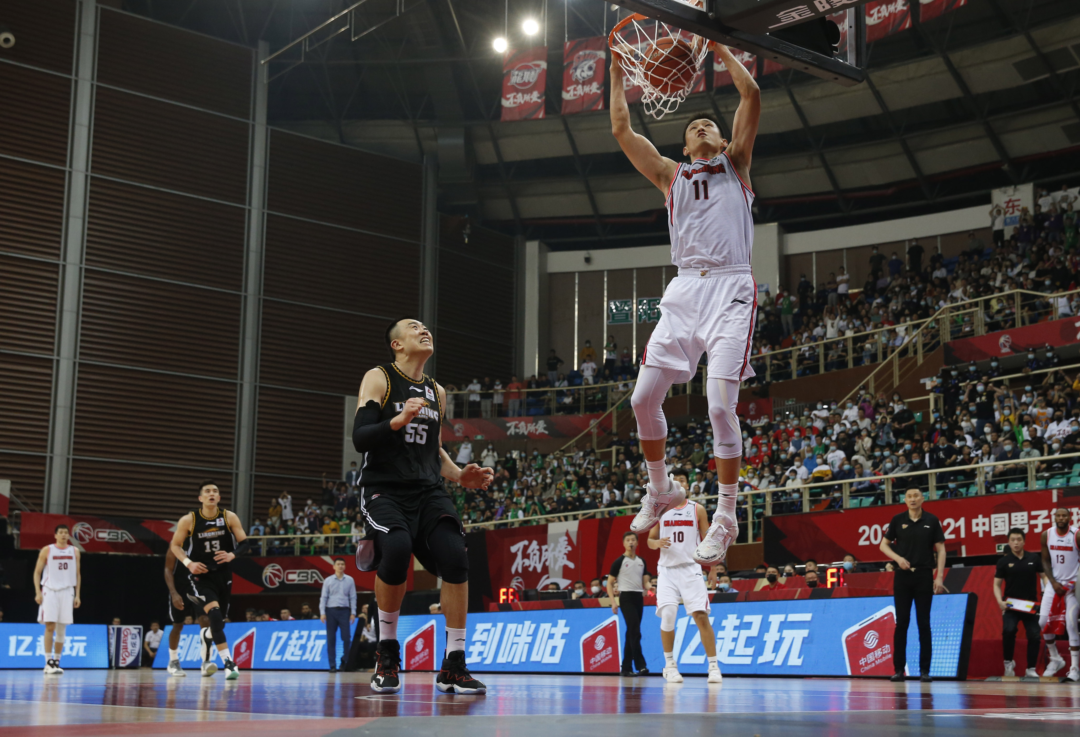 4月27日,广东队球员周鹏(上)在比赛中扣篮。新华社记者孟永民摄