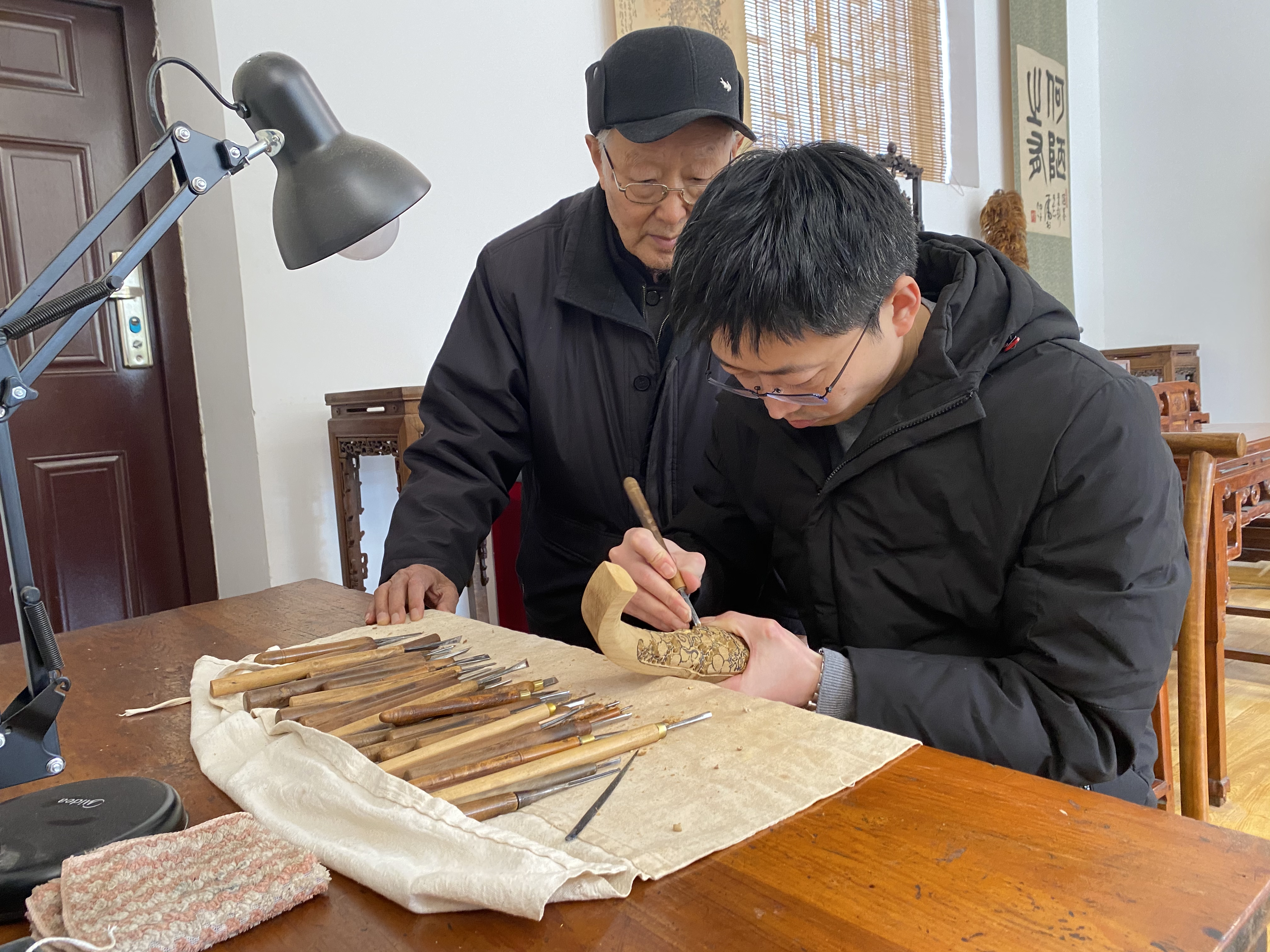 图为颜景新指导颜廷君雕刻楷雕如意。新华社记者张昕怡 摄
