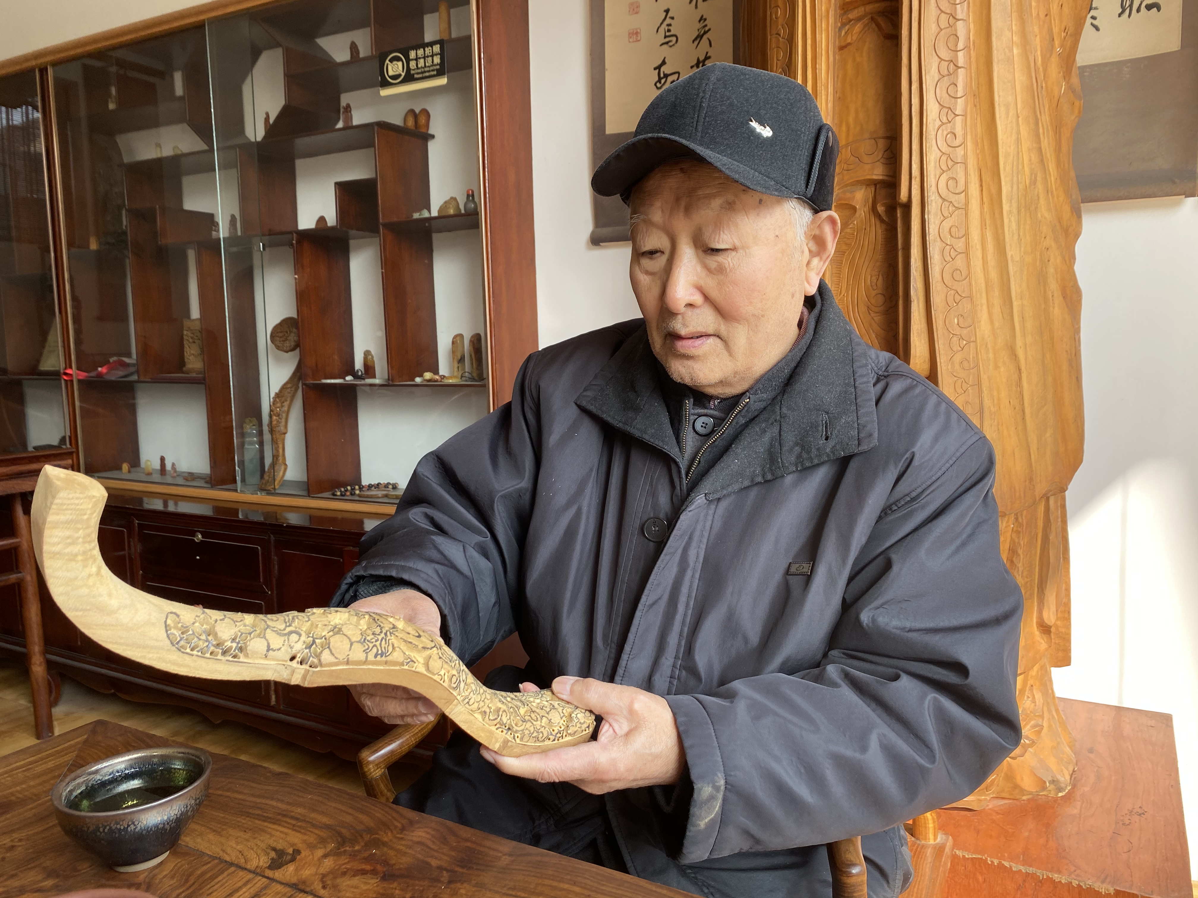 “楷雕第一步在于选材,只有在孔林里生长的楷树才能成为楷雕上等的原料。”对于楷木雕刻,传承人颜景新有自己的坚持。