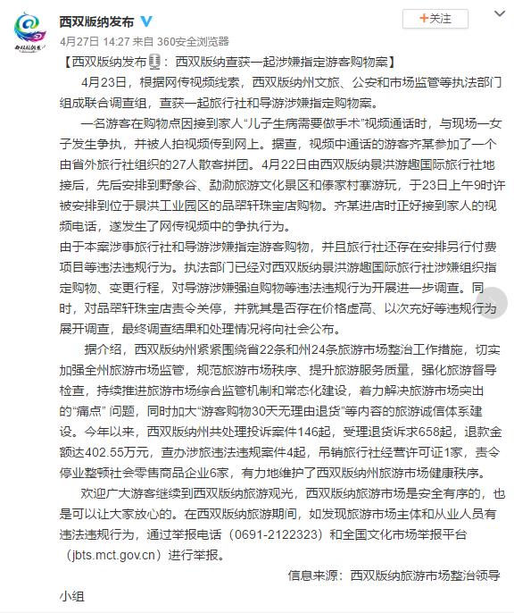 一名游客在购物点因接到家人“儿子生病需要做手术”视频通话时,与现场一女子发生争执,并被人拍视频传到网上。据查,视频中通话的游客齐某参加了一个由省外旅行社组织的27人散客拼团。4月22日由西双版纳景洪游趣国际旅行社地接后,先后安排到野象谷、勐泐旅游文化景区和傣家村寨游玩,于23日上午9时许被安排到位于景洪工业园区的品翠轩珠宝店购物。齐某进店时正好接到家人的视频电话,遂发生了网传视频中的争执行为。
