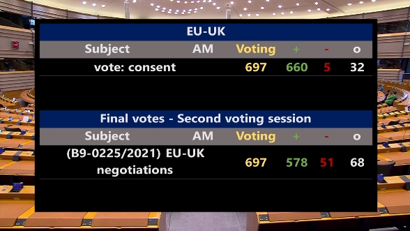 欧洲议会全体会议28日以660票赞成、5票反对、32票弃权的投票结果通过欧盟与英国就未来关系达成的协议。