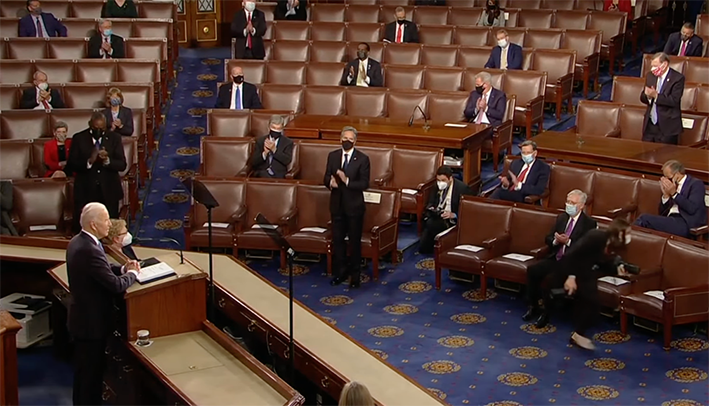 △拜登在国会演讲时,起立鼓掌的大多是民主党,坐着的是共和党,派别分明。