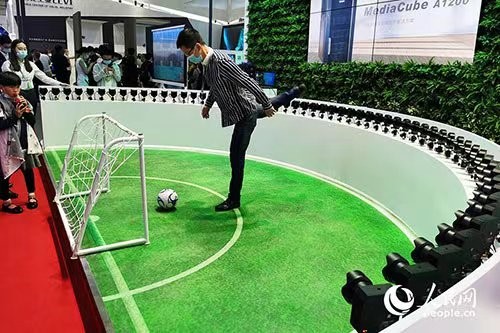市民在足球互动展区感受“超高清+自由视角”的精彩瞬间。人民网 刘卿摄