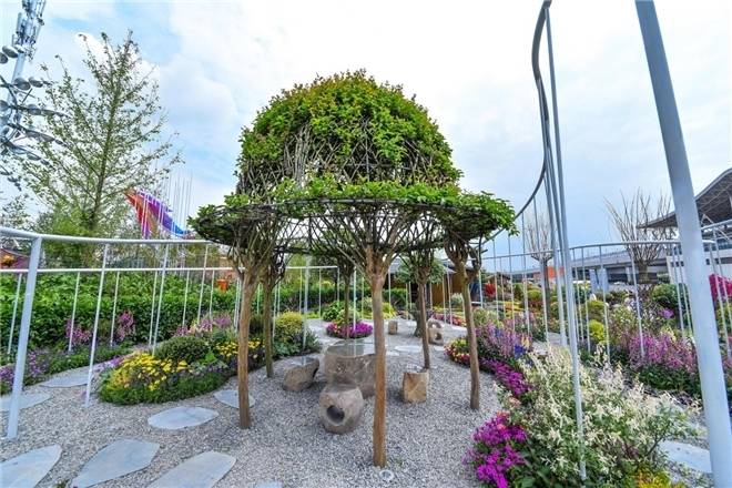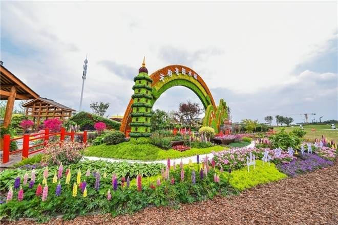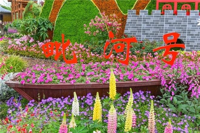 青白江展区以“丝路花礼”这一可进入、可参与的主题花境景观作品充分体现了面向泛欧泛亚、“一带一路”的陆港主枢纽、中欧班列(成都)始发地特色。