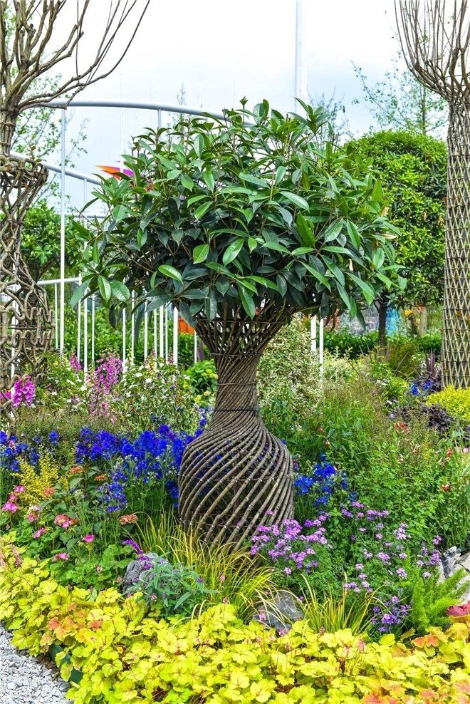 温江展园设计充分表达温江是全国花木主产区的特色,把川派盆景和植物编艺与花境植物结合,营造趣味、安逸和舒适的花园。川派盆景造型的罗汉松植于入口,表达迎客寓意;紫薇、杜鹃、桂花编织的花瓶既展示了温江花木人的高超技艺,也寓意美好生活平安如意。