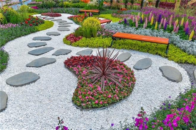 羽扇豆、花烟草、白子莲、金鸡菊......几十余种色彩相宜的时令花卉打造出错落有致的组团花境,如果沿着块石汀步走累了的话,就在群花环绕的休闲座椅上歇歇脚吧。