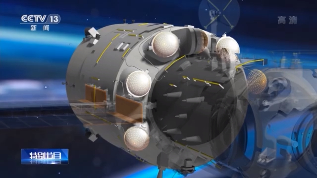 大柱段前缘与小柱段交接处,这里有6个球形装置,格外抢眼。它们的名字叫“控制力矩陀螺”,是燃料零消耗条件下进行姿态控制的手段,因为它们消耗的是电能。这些球形装置在我们之前的交会对接任务中就发挥过关键的作用。