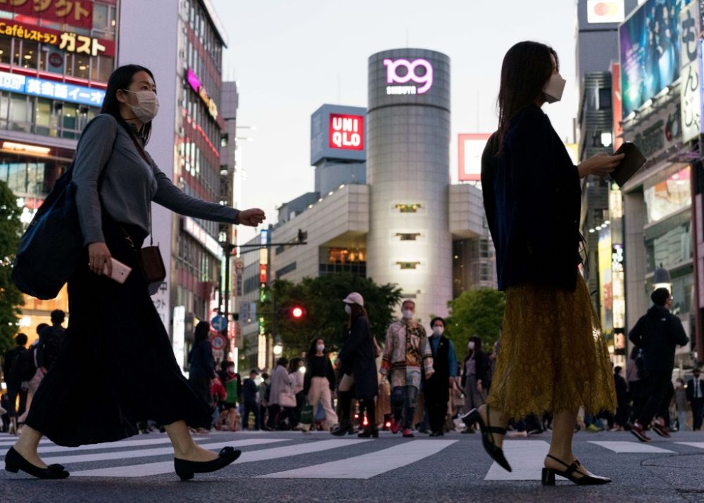 4月23日,人们佩戴口罩走在日本东京涩谷街头。由于疫情恶化,日本政府23日晚再次宣布东京都、大阪府、京都府、兵库县4地进入紧急状态。(新华社发,克里斯托弗·朱摄)