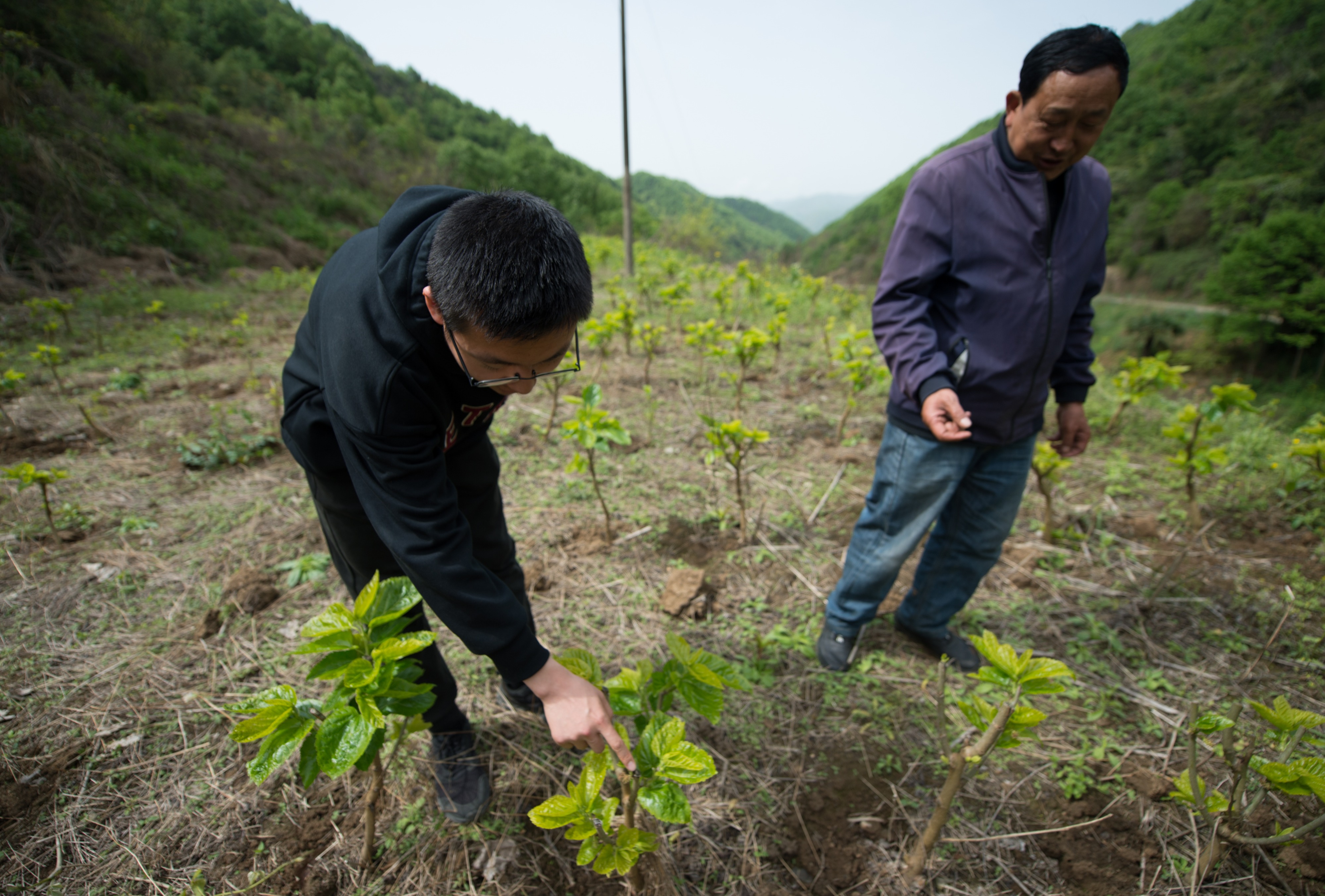 4月16日,在陕西省汉中市西乡县子午镇七星坝村,武轩羽(左)与村民王顺生一起查看桑树树苗生长情况。新华社记者 魏翔 摄