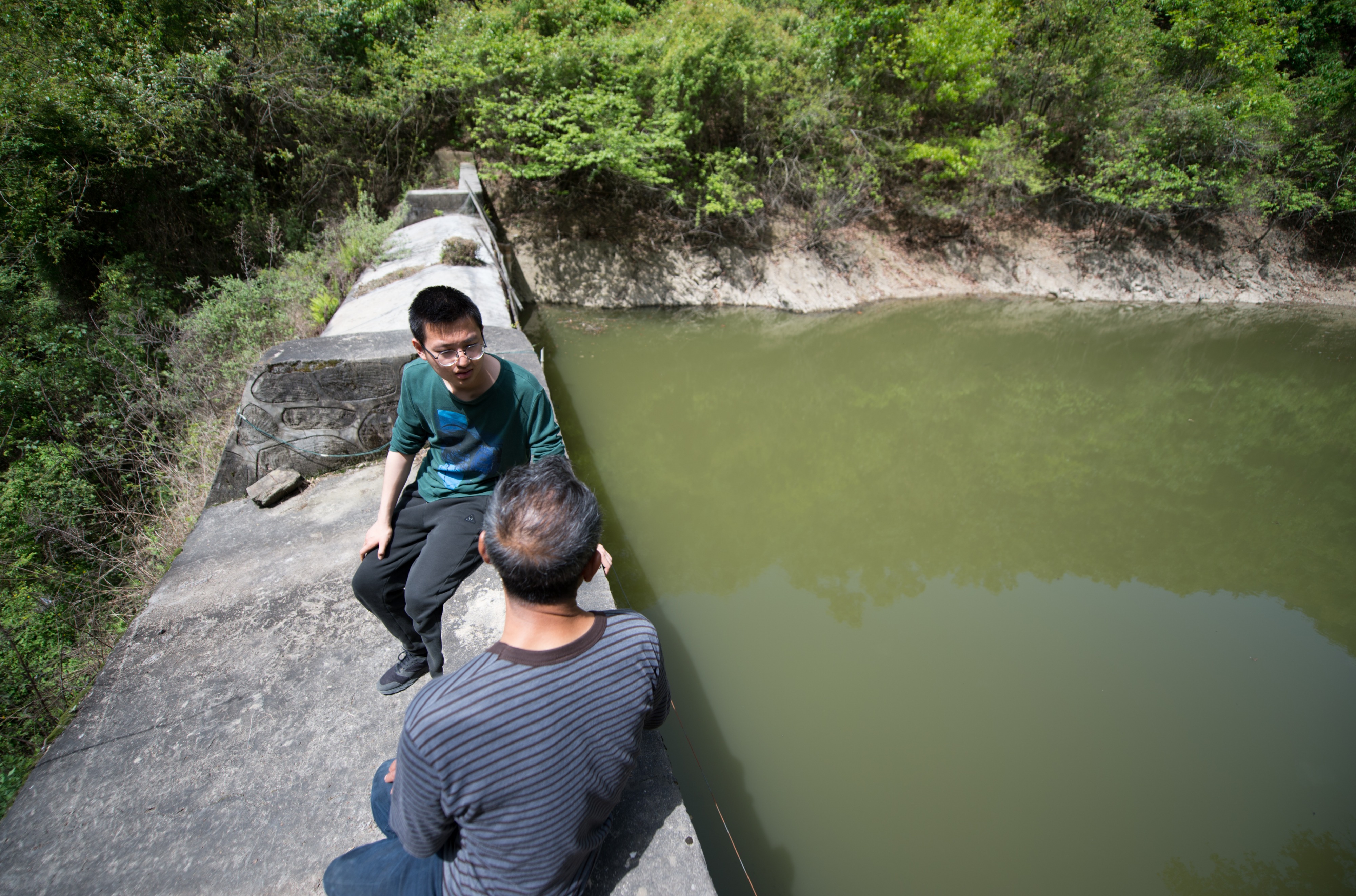 4月16日,在陕西省汉中市西乡县子午镇七星坝村,武轩羽(上)在村民王忠兵承包的鱼塘边与他交谈。新华社记者 魏翔 摄