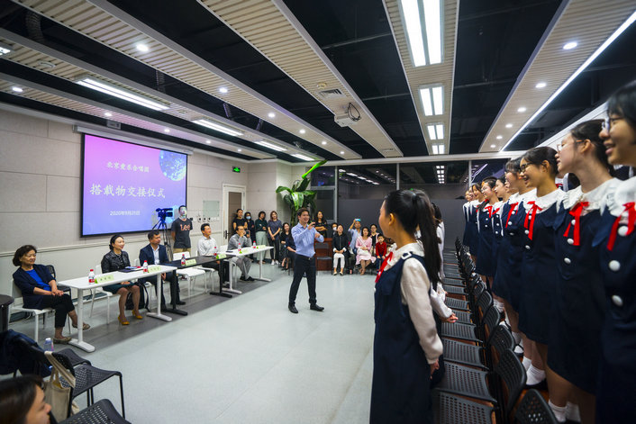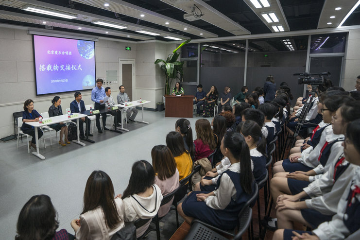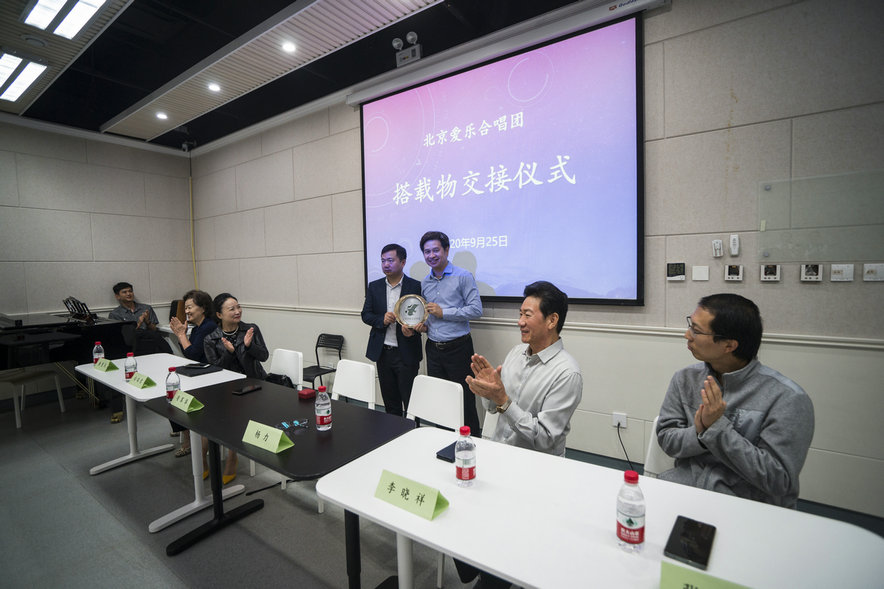 早在此次卫星升空之前,2020年9月25日,北京爱乐合唱团在长安兴融中心合唱教室举行了“北京爱乐合唱团卫星搭载物交接仪式”。出席此次活动的嘉宾有:“航升一号”卫星总设计工程师项军华博士,北京爱太空科技发展有限公司董事长白瑞雪女士,中国合唱协会副理事⻓兼秘书长李小祥先生,北京爱乐合唱团团⻓杨力教授,北京爱乐合唱团理事长唐重庆教授,北京爱乐合唱团理事蔡珍女士、赵琳老师、王天阳老师、冯向⻘老师以及合唱团的部分任课老师和团员。