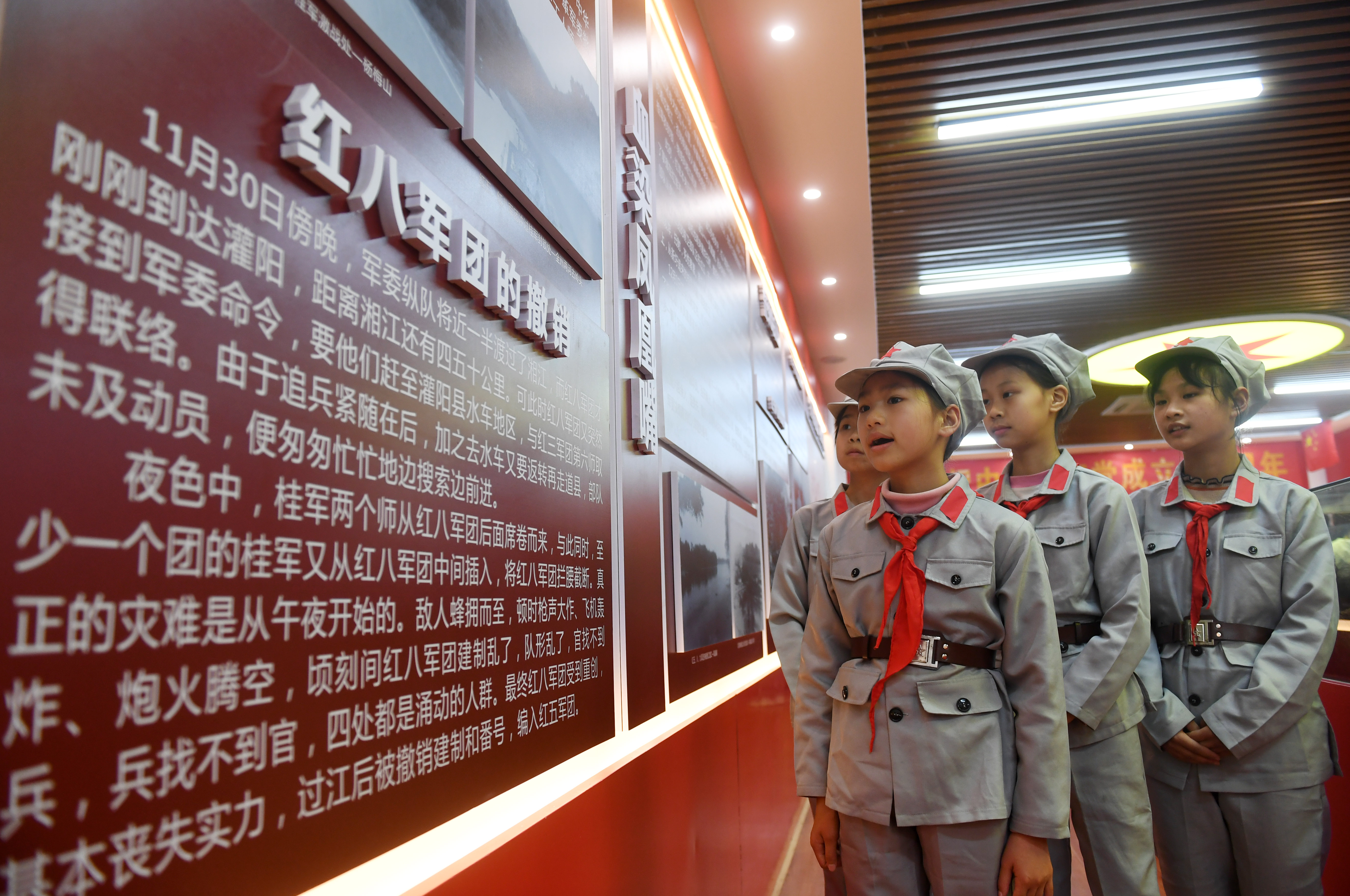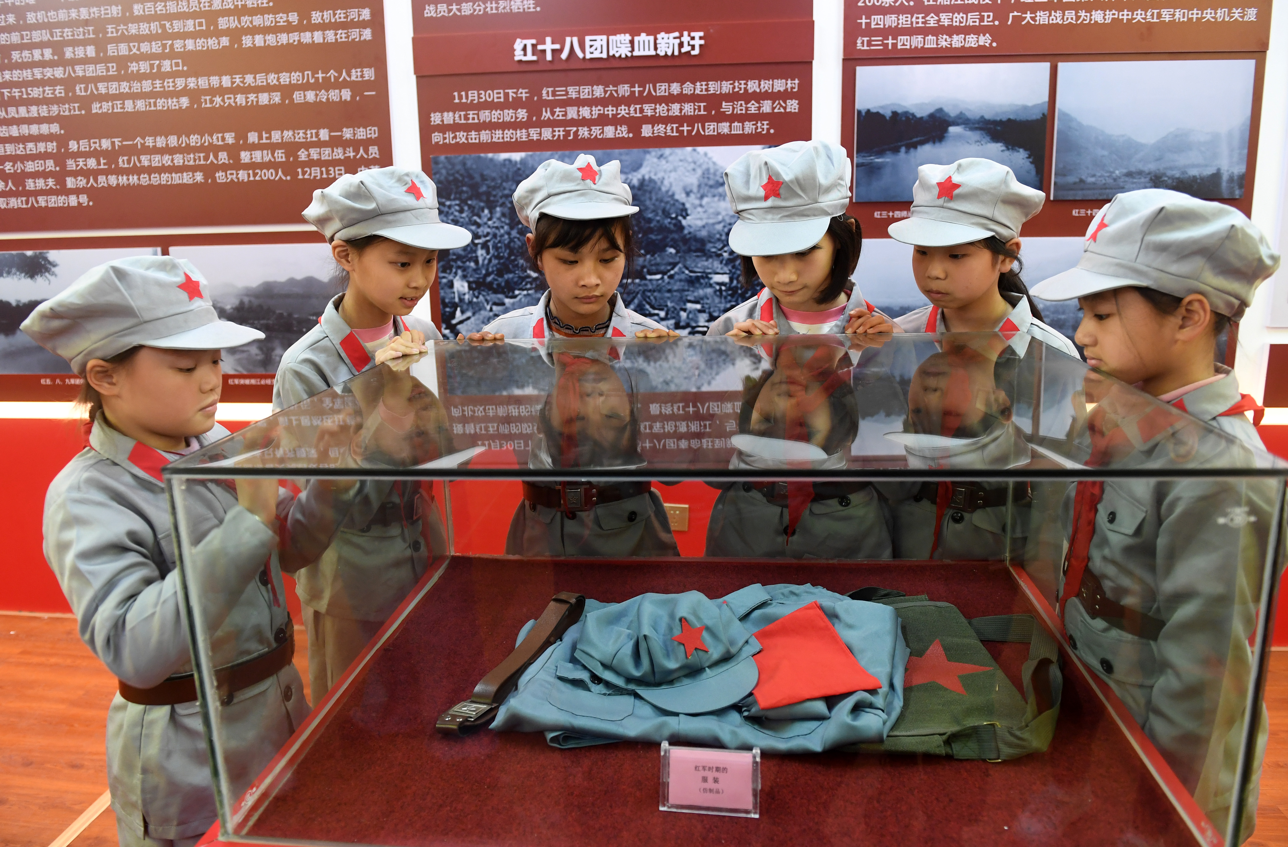 全州县凤凰镇和平红军小学学生在学校红军长征湘江战役展览室内参观(新华社记者陆波岸4月26日摄)。