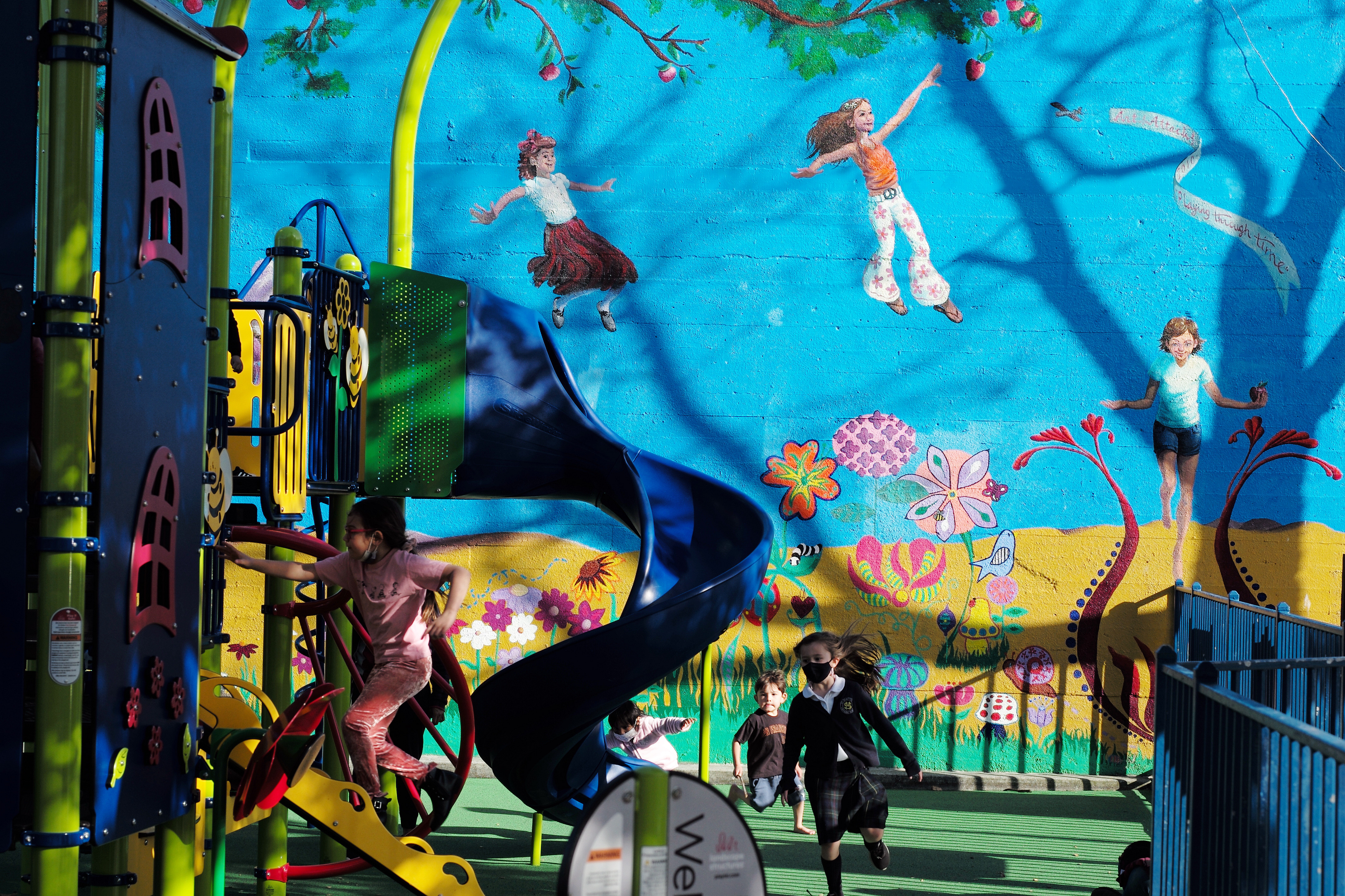 3月29日,儿童在美国加利福尼亚州北部小城伯灵格姆街头的一个重新开放的游乐场玩耍。(新华社记者吴晓凌摄)