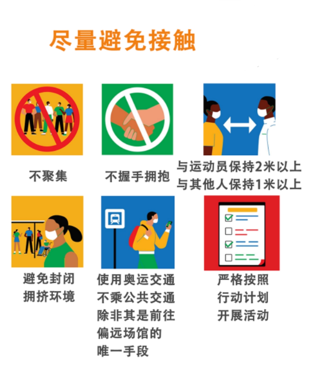 新版的防疫手册明确要求运动员从抵达机场开始,就不能到处乱逛,连机场的商店都不能去。在日本期间,也不能进入观众区,需要最大限度减少与公众的接触,除了不能乘坐公共交通,还不能前往旅游景点、商店、餐馆、酒吧、公共健身房等地。另外,见面要避免身体接触,不要握手拥抱,互相之间要避免没事瞎聊天,遇到精彩场面也不能欢呼,只能鼓掌。
