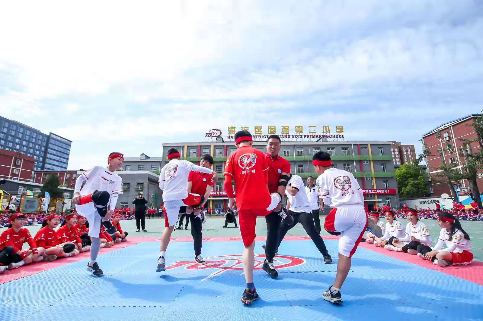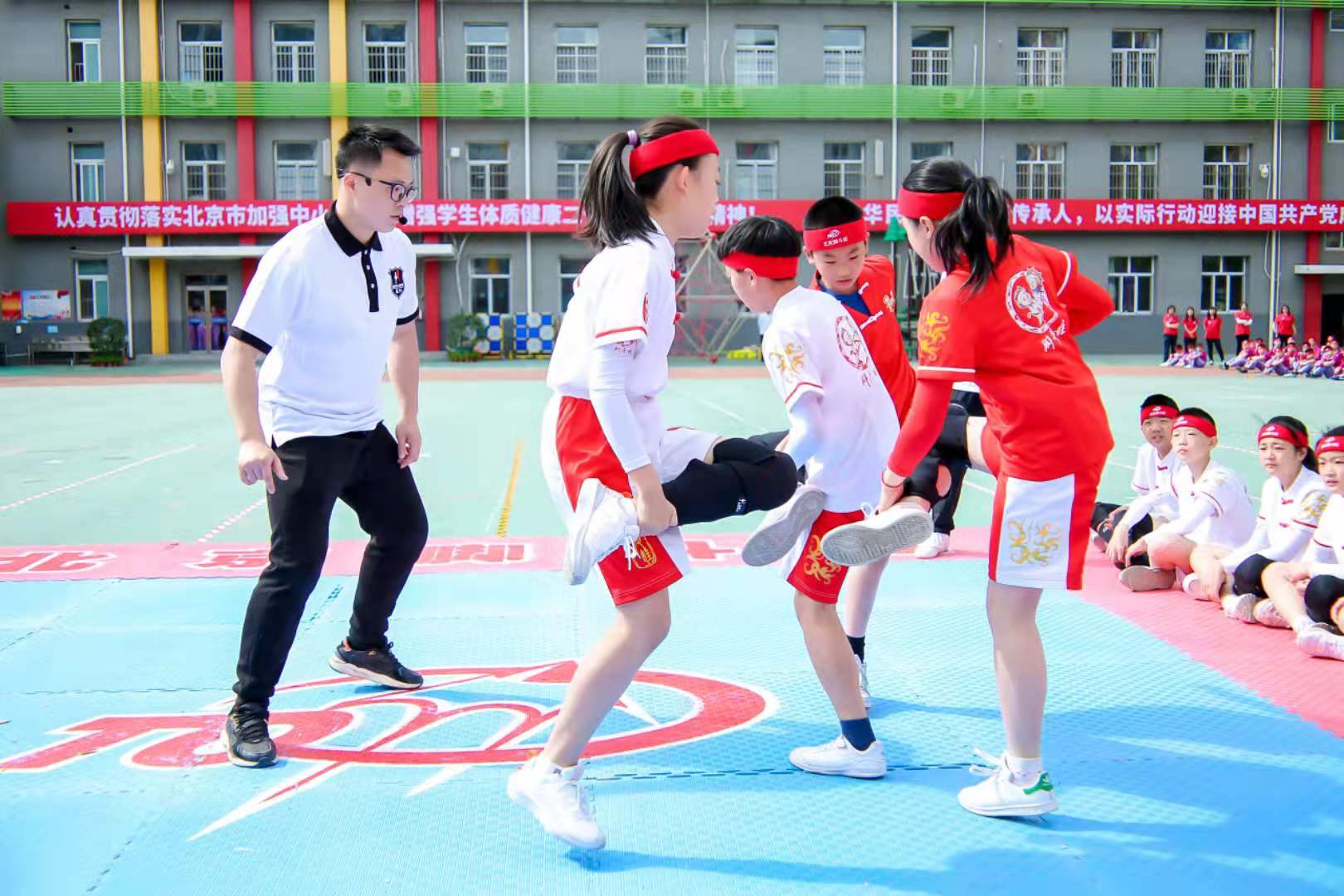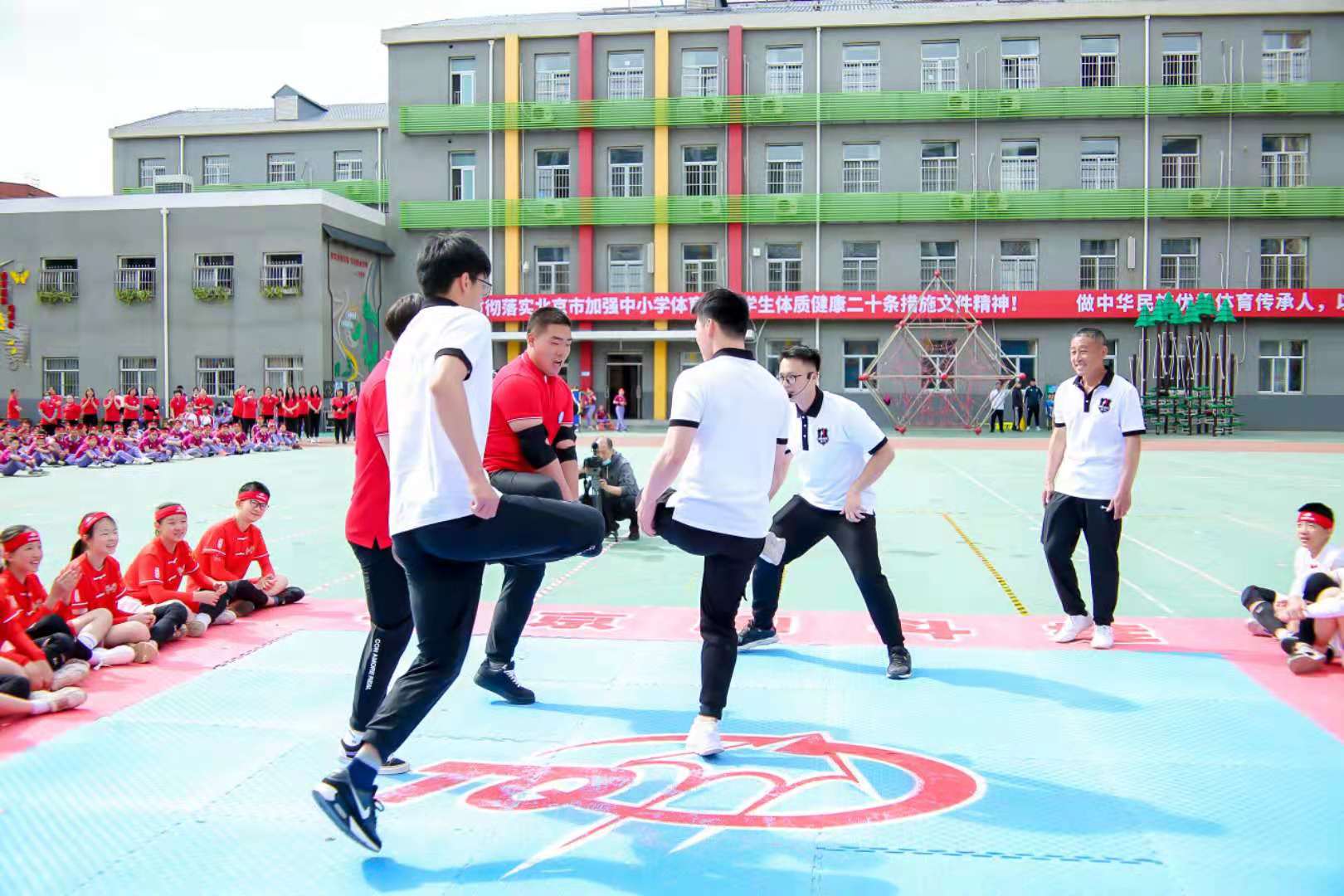 活动在举行完脚斗娃韵律操、竞势、竞速环节后,进入最后的精彩对战。两名男体育老师看得兴起,也端脚加入,二人对战四名孩子。孩子们虽然面无惧色,无奈老师身高马大,拥有绝对的吨位优势,学生只能败北。