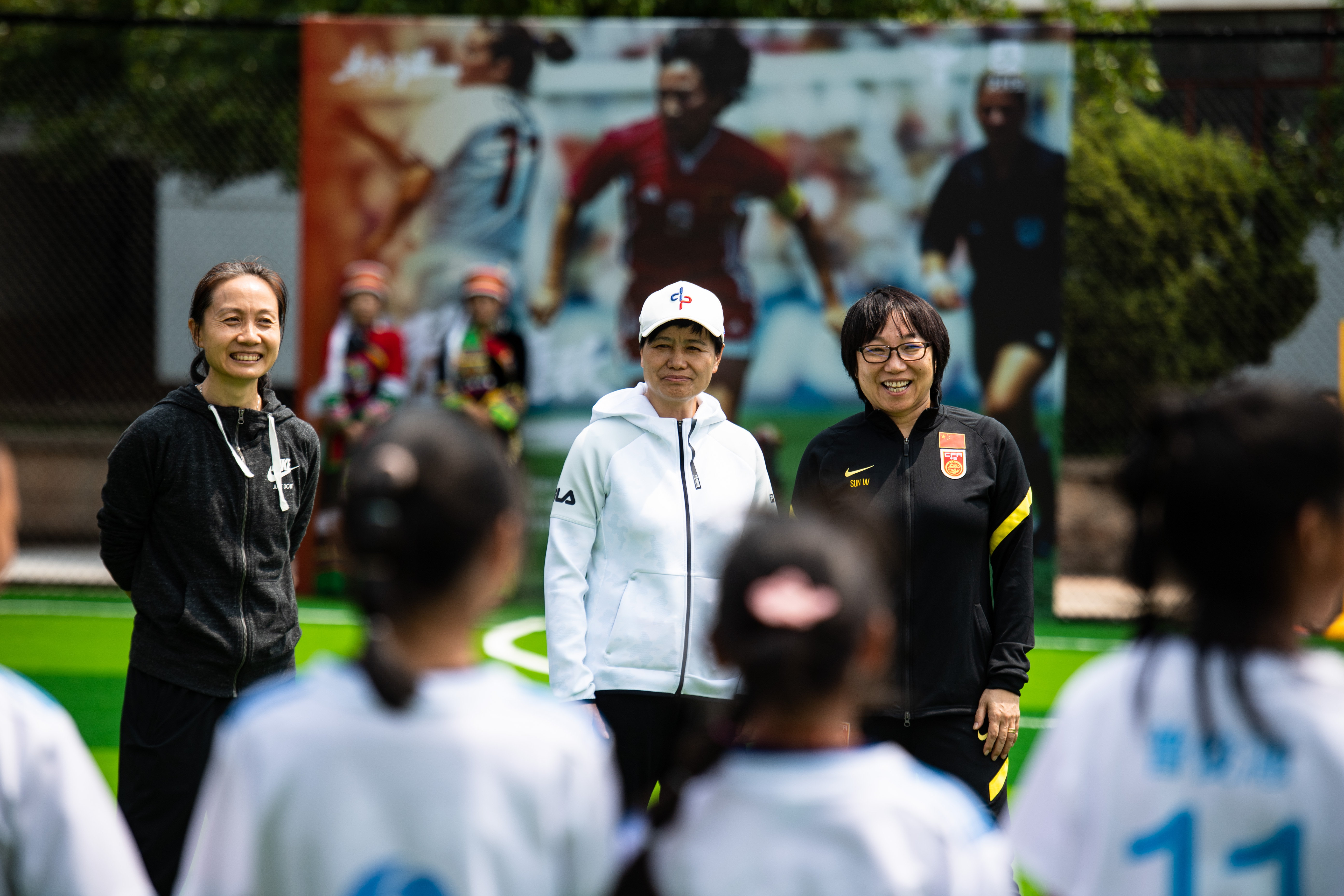 4月28日,中国足协副主席孙雯(右)、前女足队员刘爱玲(中)、王丽平在主题球场与小队员见面。新华社记者 王冠森 摄