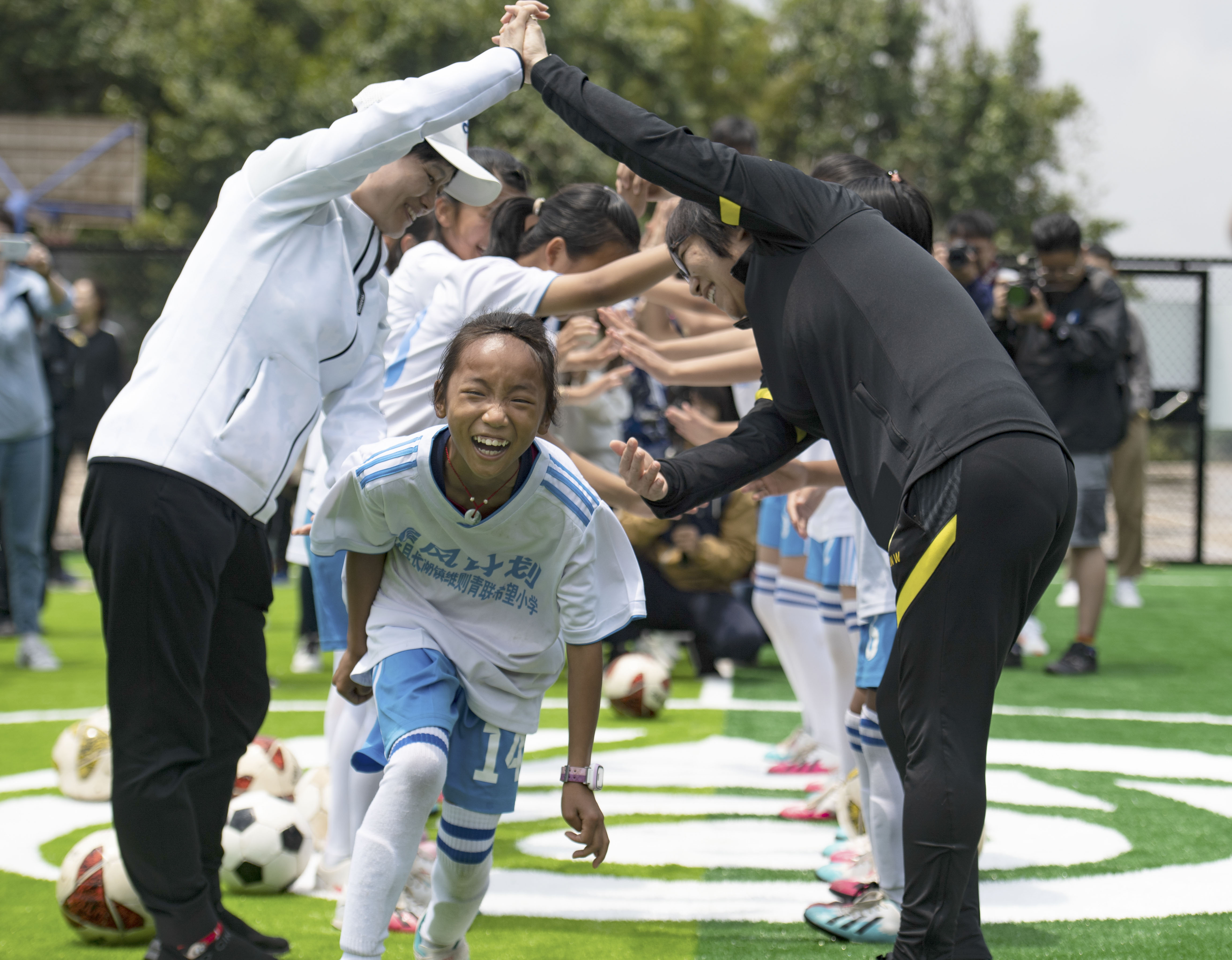 4月28日,中国足协副主席孙雯(前右)、前女足队员刘爱玲(前左)在主题球场与小队员们进行热场活动。新华社记者 王冠森 摄