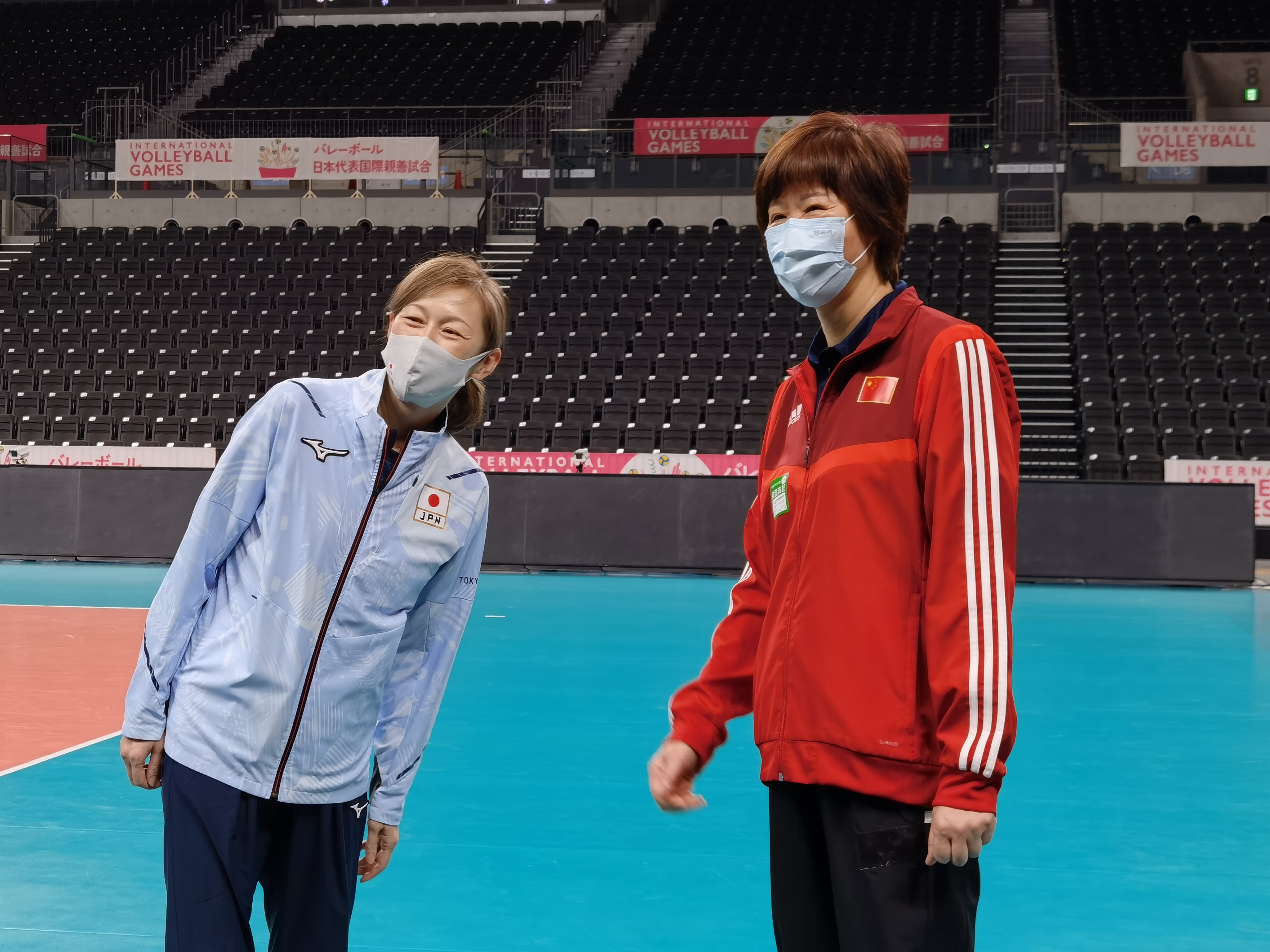 中国女排主教练郎平和日本女排主教练中田久美在赛场合影留念。合影时,两人都戴着口罩,保持了大约1米的距离。