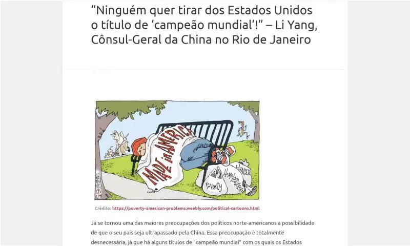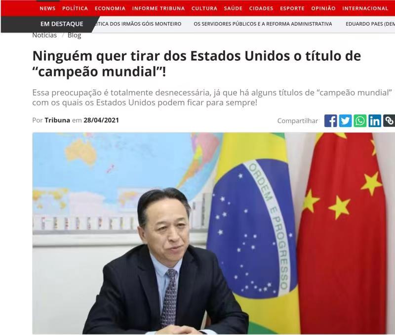 近日,中国驻巴西里约热内卢总领事李杨在巴西《商业观察报》、《媒体论坛报》、人民时刻网、《国际关系》杂志等巴西主流媒体发表题为《没人跟美国抢“第一”!》的署名文章,针对美国政客担心被中国超越的心理,从多个方面阐述了美国的劣迹“世界第一”,没人稀罕!
