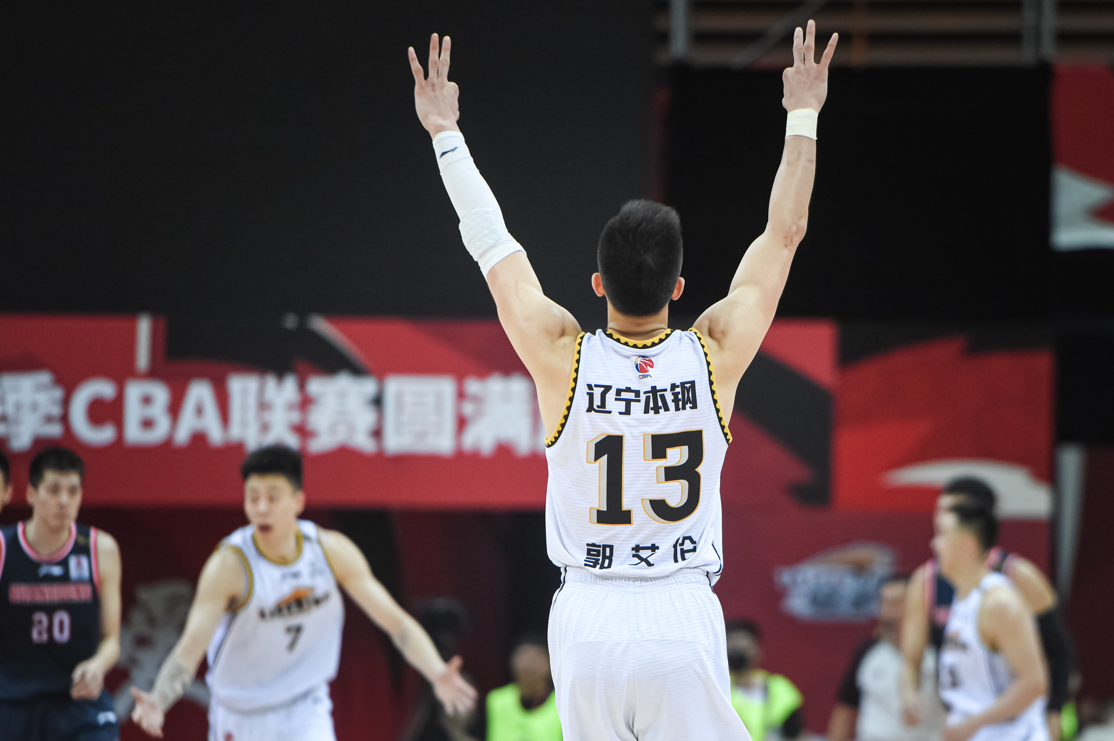 4月29日,辽宁本钢队球员郭艾伦(前)在加时赛中命中三分球后庆祝。新华社记者 江汉 摄