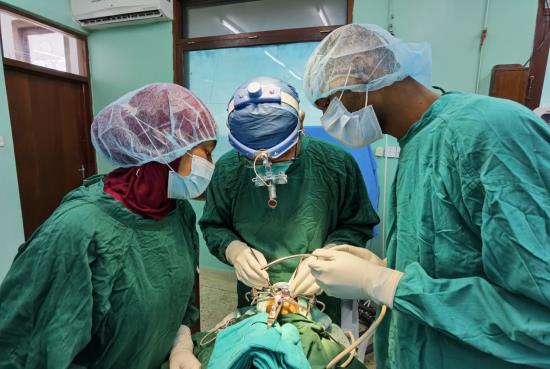 △阿布德(左一)和周医生(中)一起进行颌面外科手术