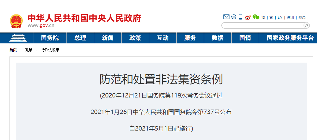 《防范和处置非法集资条例》自2021年5月1日起施行。
