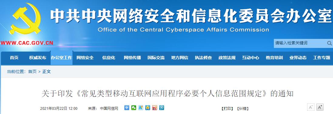 《常见类型移动互联网应用程序必要个人信息范围规定》将于5月1日施行。