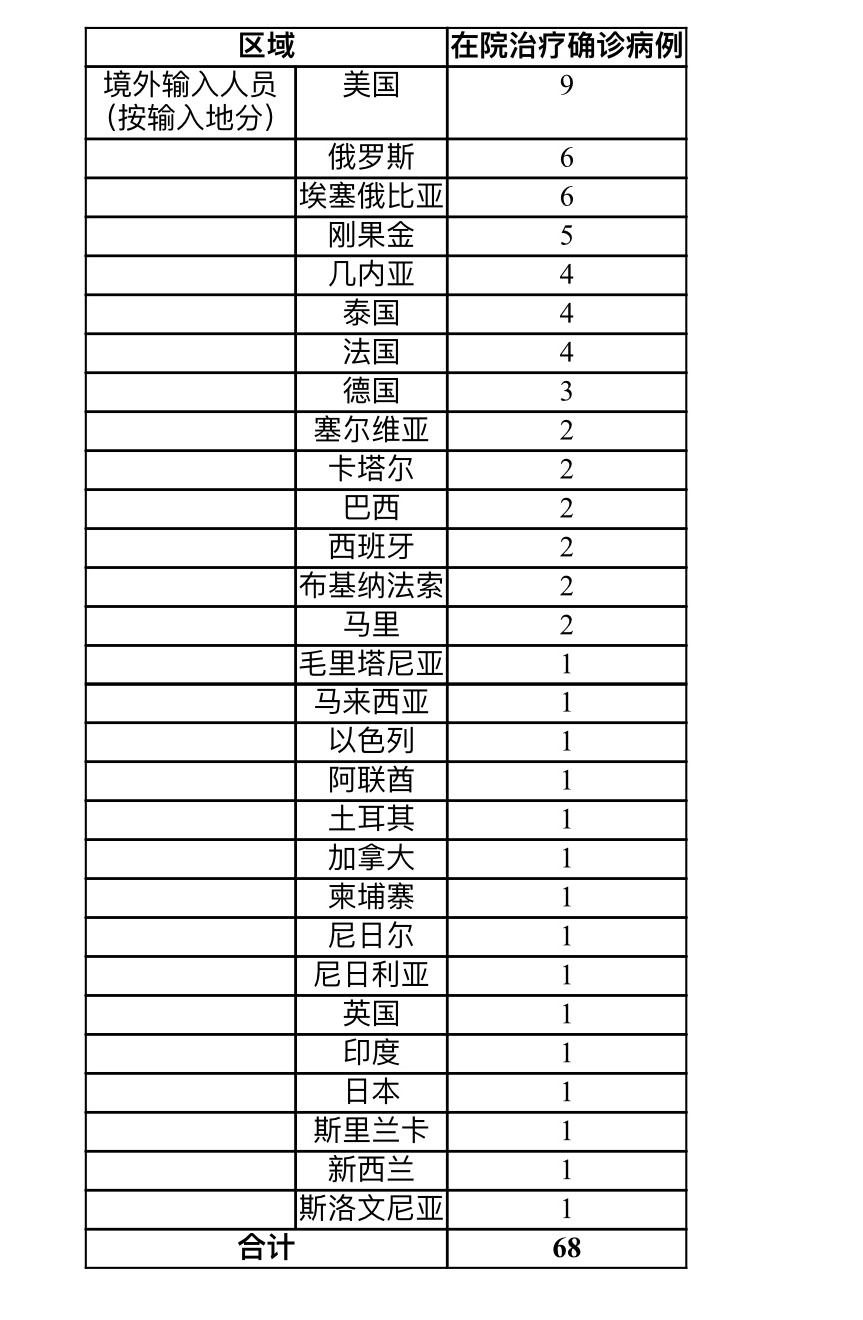 截至2021年4月29日24时,累计境外输入确诊病例1613例,出院1545例,在院治疗68例。现有待排查的疑似病例9例。
