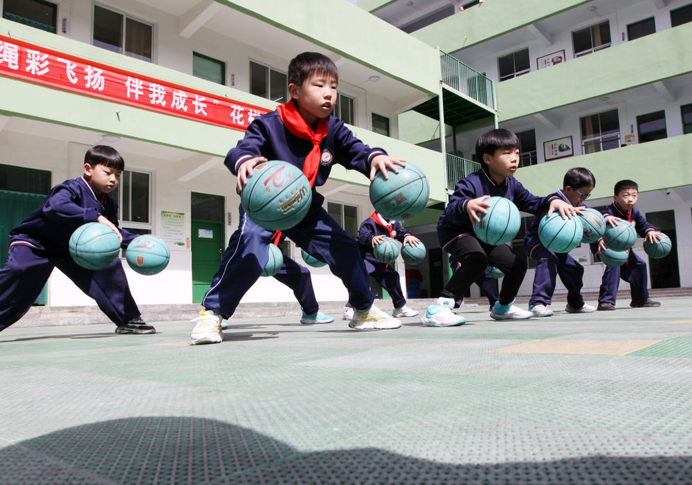↑4月29日,河南省博爱县勤奋小学举行花样篮球比赛。