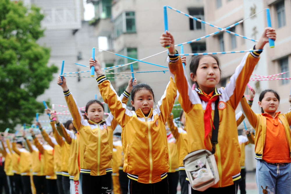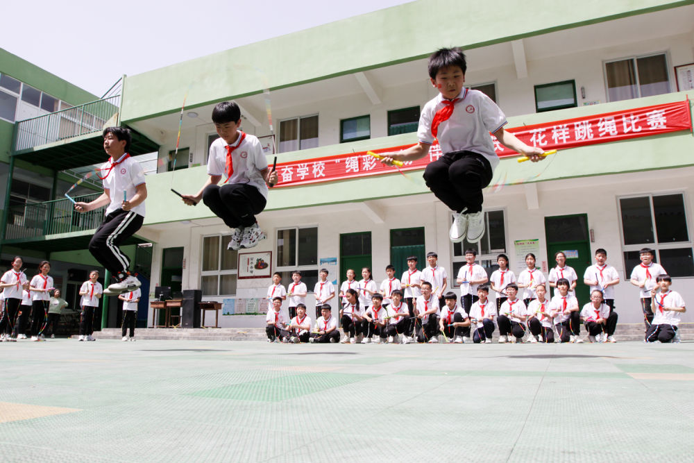 ↑4月29日,河南省博爱县勤奋小学举行花样跳绳比赛。