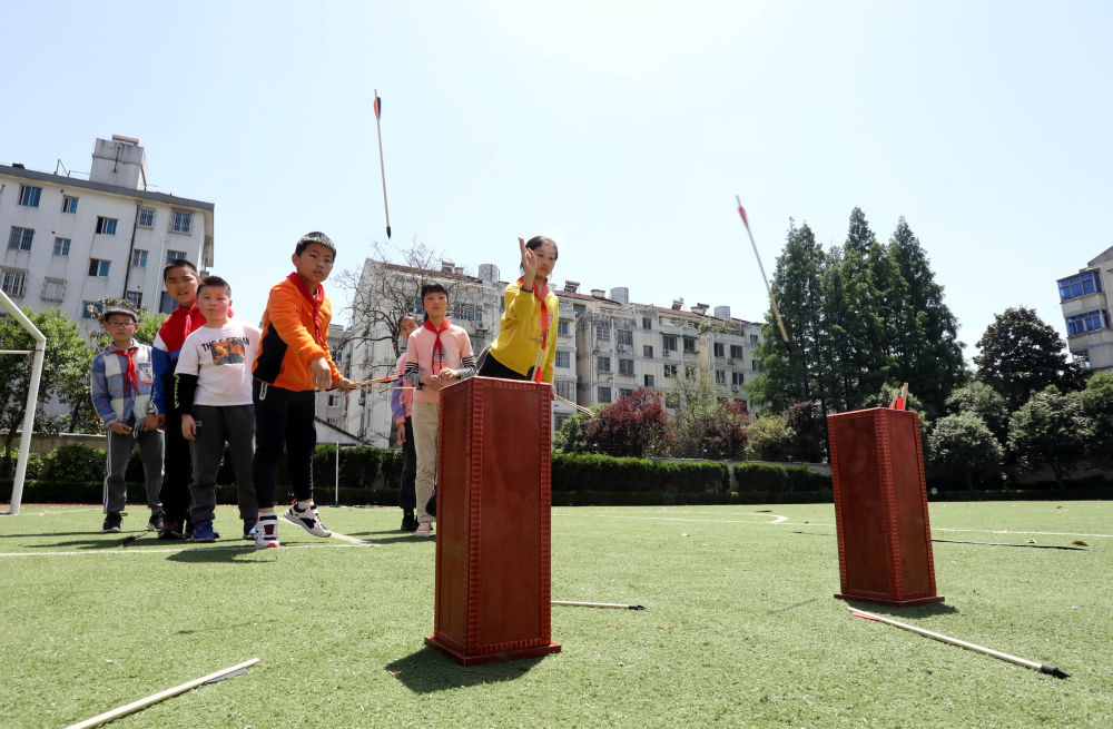 ↑4月29日,在江苏省苏州市彩香实验小学校,孩子们参加投壶。