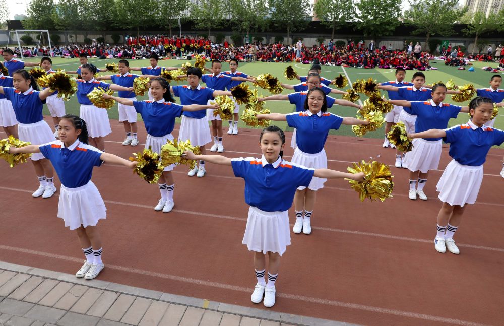 ↑4月29日,在石家庄市华兴小学,学生们参加校园啦啦操比赛。