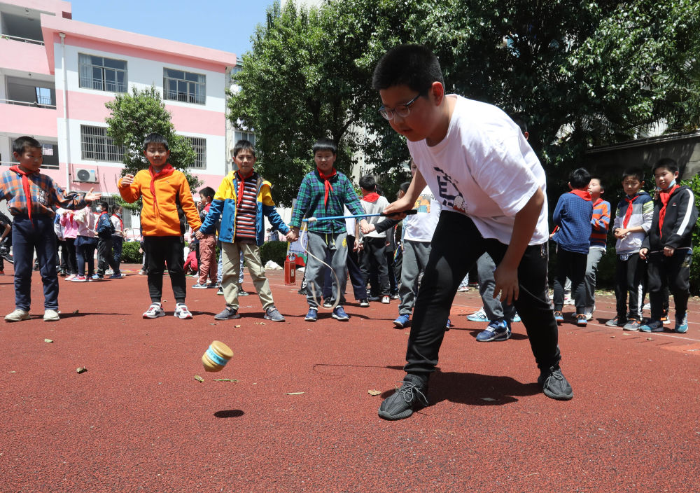 ↑4月29日,在江苏省苏州市彩香实验小学校,一个孩子在抽陀螺。